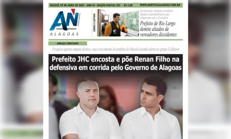 JORNAL A NOTÍCIA DIGITAL – AMEAÇA CONSTANTE! Prefeito JHC encosta e põe Renan Filho na defensiva em corrida pelo Governo de Alagoas Pesquisa aponta empate técnico, mas crescimento do prefeito de Maceió acende alerta no grupo Calheiros ABR-225