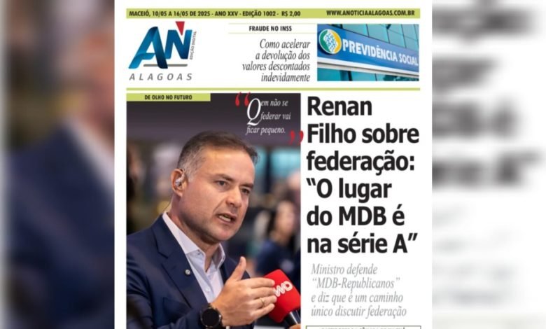 JORNAL A NOTÍCIA DIGITAL – DE OLHO NO FUTURO! Renan Filho sobre federação: “O lugar do MDB é na série A” Ministro defende “MDB-Republicanos” e diz que é um caminho único discutir federação MAIO-1002