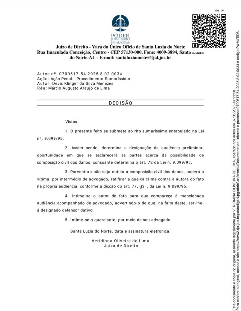 Santa Luzia do Norte (AL) – A Juíza da Vara do Único Ofício da Comarca de Santa Luzia do Norte determinou a designação de audiência preliminar no processo penal que tem como autor o jornalista Devis Menezes e como réu o ex-prefeito Márcio Augusto Araújo de Lima. O caso tramita sob o rito sumaríssimo, conforme prevê a Lei nº 9.099/95, que trata dos Juizados Especiais Criminais para infrações de menor potencial ofensivo.