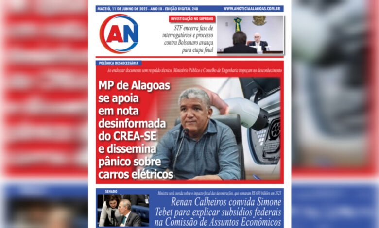 JORNAL A NOTÍCIA DIGITAL – POLÊMICA DESNECESSÁRIA! MP de Alagoas se apoia em nota desinformada do CREA-SE e dissemina pânico sobre carros elétricos Ao endossar documento sem respaldo técnico, Ministério Público e Conselho de Engenharia tropeçam no desconhecimento JUN-240-1