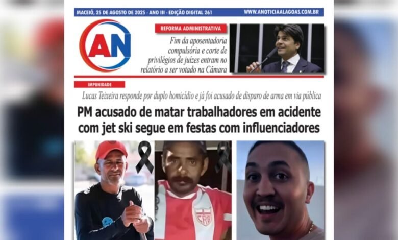 JORNAL A NOTÍCIA DIGITAL – IMPUNIDADE! PM acusado de matar trabalhadores em acidente com jet ski segue em festas com influenciadores Lucas Teixeira responde por duplo homicídio e já foi acusado de disparo de arma em via pública AGO-261