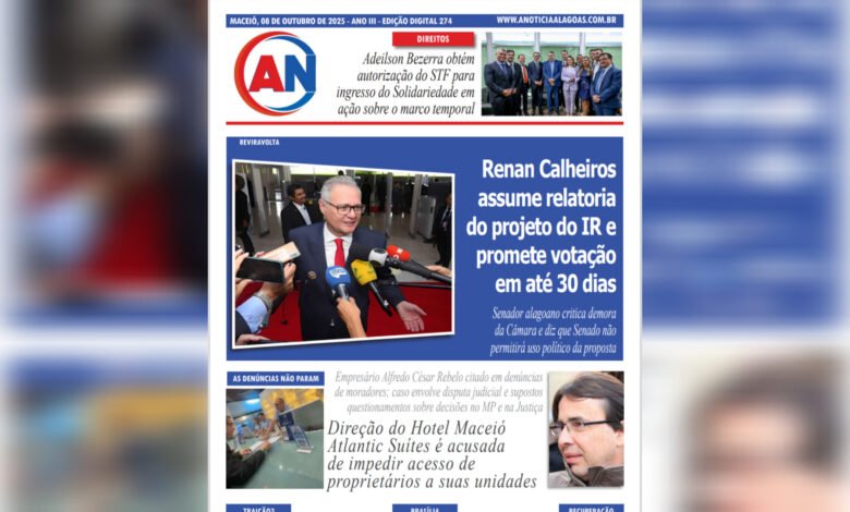 JORNAL A NOTÍCIA DIGITAL – REVIRAVOLTA! Renan Calheiros assume relatoria do projeto do IR e promete votação em até 30 dias Senador alagoano critica demora da Câmara e diz que Senado não permitirá uso político da proposta OUT-274