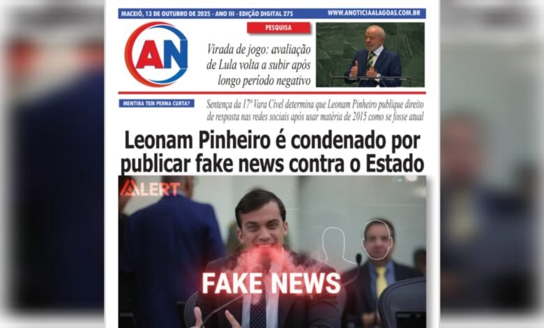 JORNAL A NOTÍCIA DIGITAL – MENTIRA TEM PERNA CURTA? Leonam Pinheiro é condenado por publicar fake news contra o Estado Sentença da 17ª Vara Cível determina que Leonam Pinheiro publique direito de resposta nas redes sociais após usar matéria de 2015 como se fosse atual OUT-275