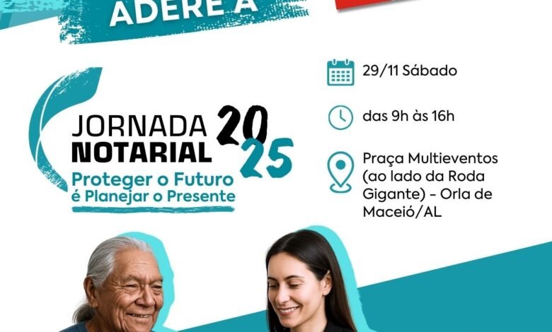Os Cartórios de Notas de Alagoas realizam no próximo sábado (29), das 9h às 16h, uma ação pública na Praça Multieventos, na orla de Maceió, dedicada à proteção pessoal e patrimonial de pessoas idosas. A mobilização integra a Jornada Notarial 2025 – “Proteger o Futuro é Planejar o Presente”, evento nacional que ocorre simultaneamente em vários estados.