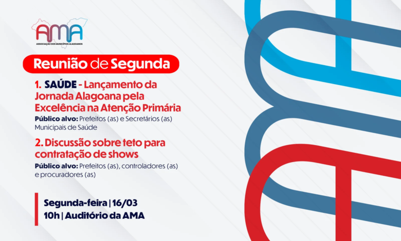 A Associação dos Municípios Alagoanos (AMA) realiza, na próxima segunda-feira (16), às 10h, reunião com prefeitos, prefeitas e equipes técnicas municipais para discutir temas importantes da gestão pública. Entre os pontos da pauta estão o debate sobre a criação de parâmetros para contratação de shows pelas prefeituras e o lançamento da Jornada Alagoana pela Excelência na Atenção Primária, iniciativa voltada ao fortalecimento da saúde nos municípios.