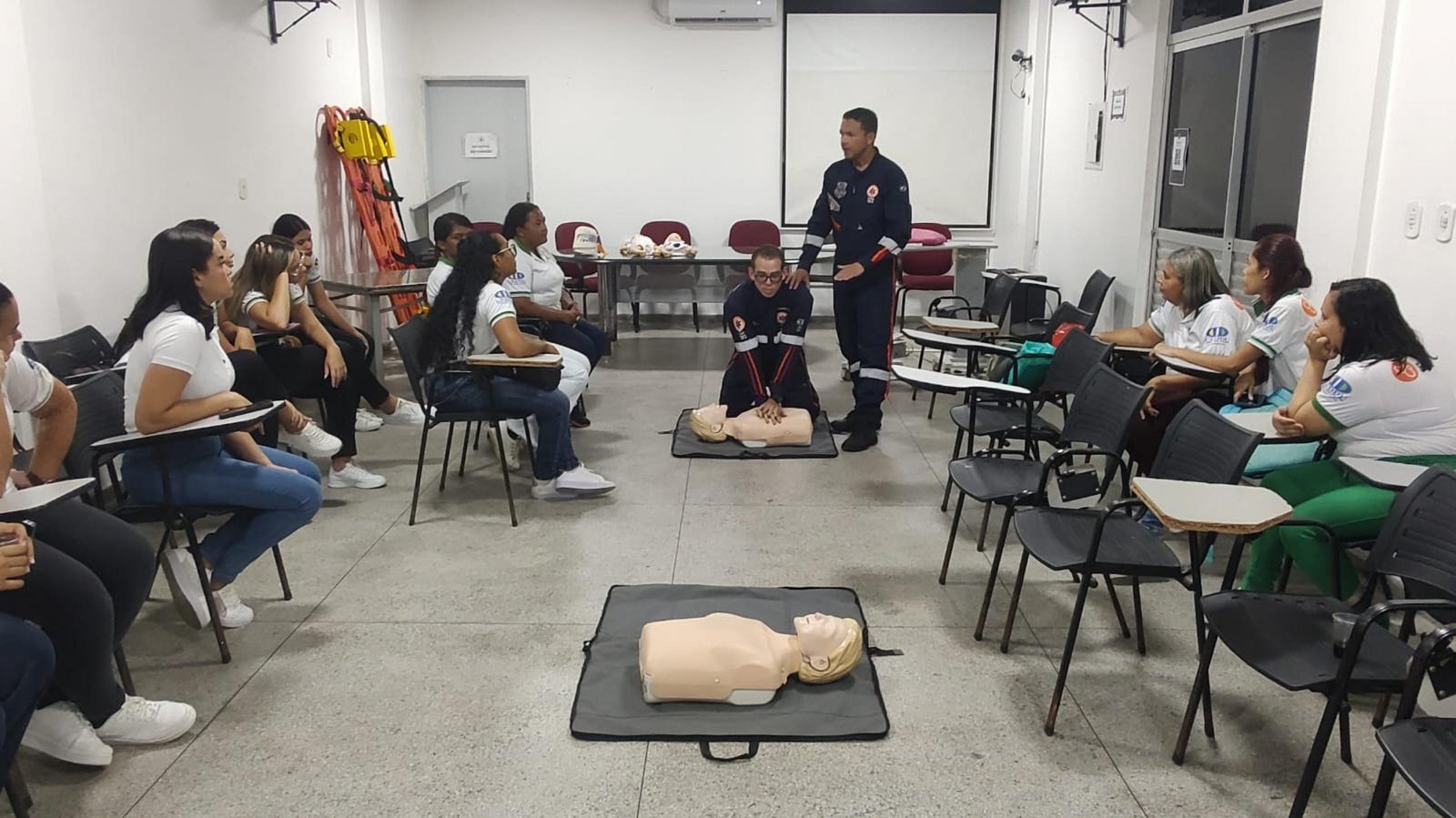 Eles tiveram aulas teóricas e práticas sobre parada cardiorrespiratória (PCR), que é a interrupção súbita dos batimentos cardíacos e da respiração, levando à falta de oxigênio no cérebro e em outros órgãos vitais, situação de emergência, na qual cada minuto sem atendimento reduz as chances de sobrevivência, tornando essencial o início imediato das manobras de ressuscitação cardiopulmonar (RCP) e o uso do desfibrilador externo automático.