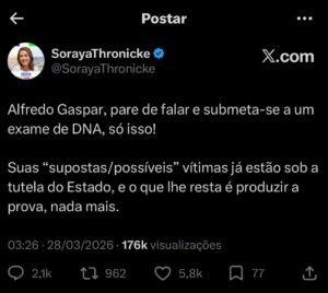 “Pare de falar e submeta-se a um exame de DNA”, escreveu a senadora, ao sustentar que a produção de prova material é essencial diante da natureza das denúncias.