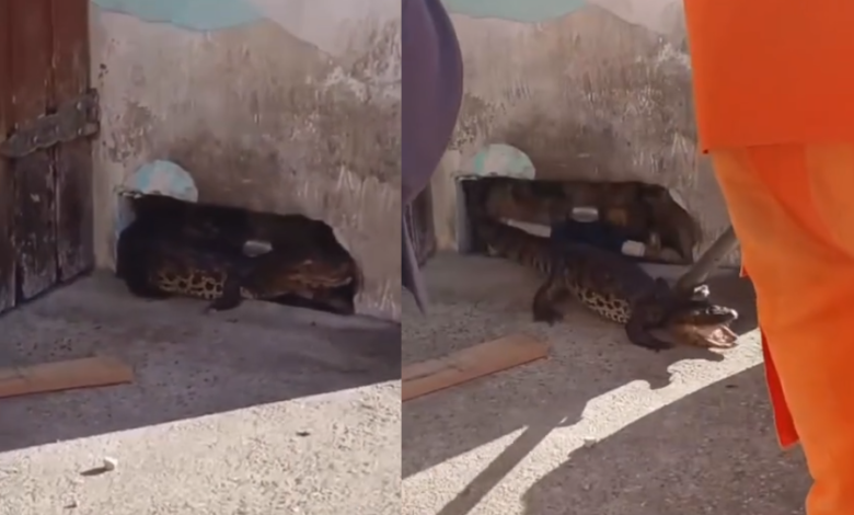 Jacaré surpreende moradores ao aparecer em frente de residência em Arapiraca
