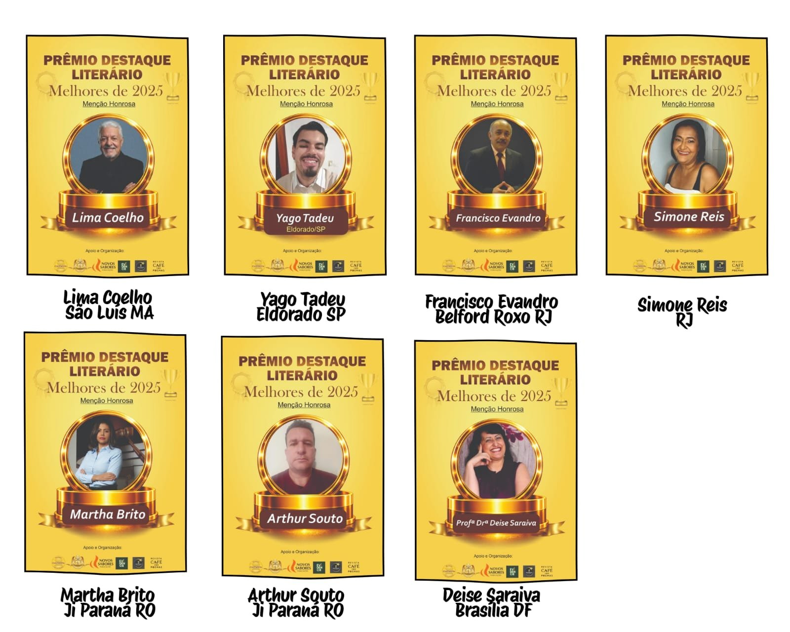 A Menção Honrosa é uma forma especial de reconhecimento concedida a autores que participaram da premiação e tiveram destaque ou relevância dentro do processo do prêmio. Trata-se de uma distinção simbólica e institucional que registra oficialmente a participação do escritor, valorizando sua trajetória literária e integrando-o às ações de divulgação e º que se destacam atualmente com suas ações e produções. Além da categoria Melhor Livro, o concurso premiou nas categorias melhor autor(a), melhor poeta, poetisa.