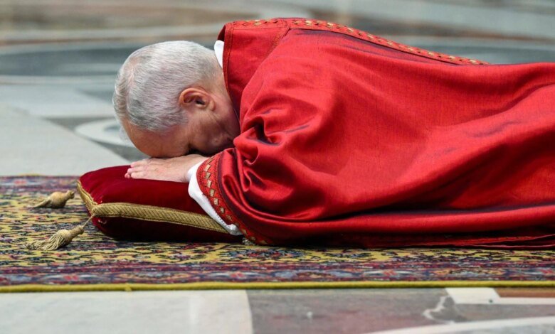 Papa Leão XIV reza deitado ao celebrar a Paixão de Cristo