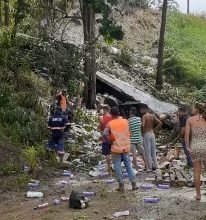 Moradores da região ajudaram o motorista a retirar a carga da pista.