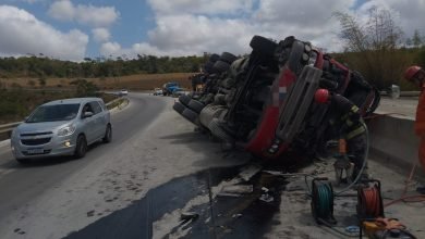 Caminhão tomba na BR-101 e condutor fica preso às ferragens em São Miguel dos Campos, AL