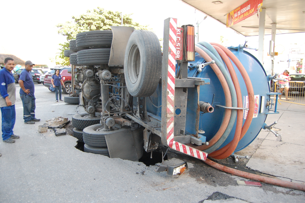 Asfalto cede e caminhão tomba em rua da Ponta Verde
