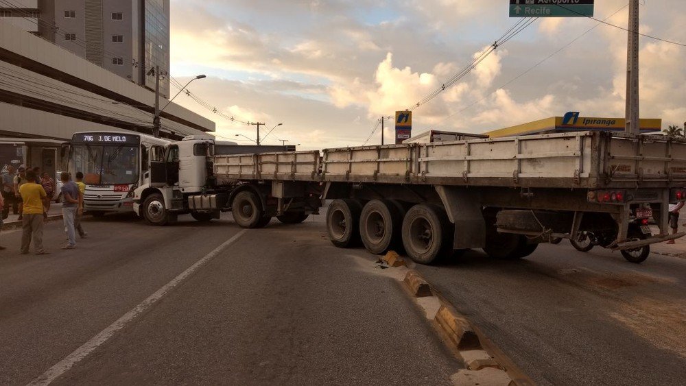 Carreta bate em ônibus e interdita avenida em Maceió